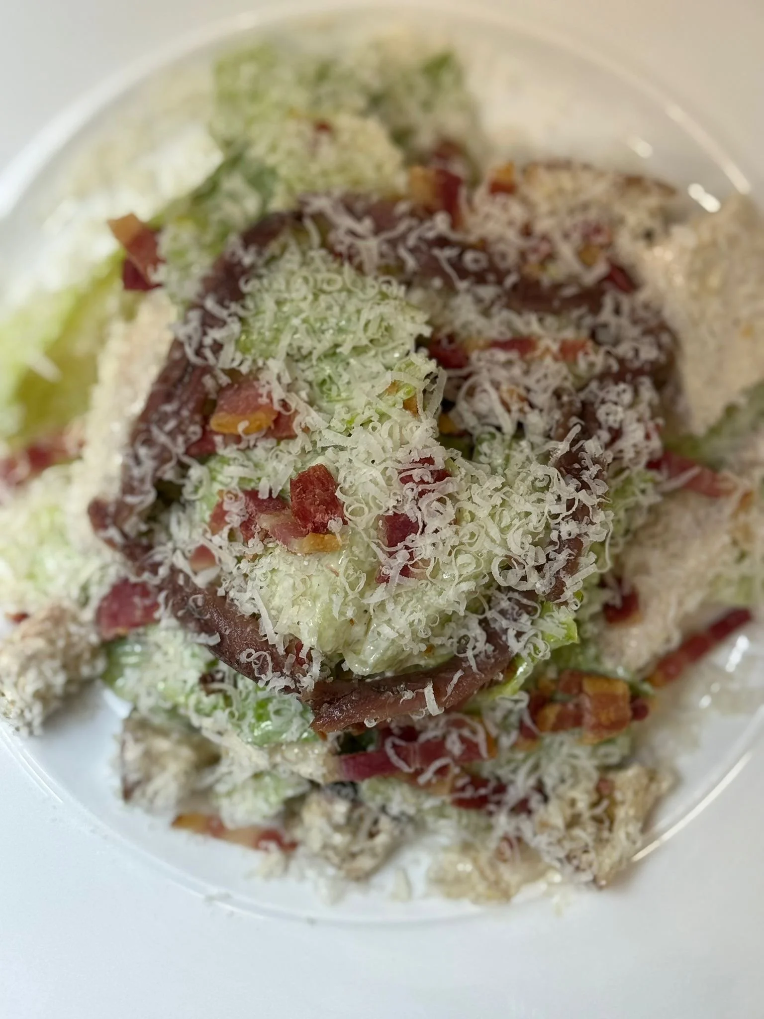 Gem lettuce, chicken, parmesan, anchovies, Caesar dressing, crispy bacon, & sourdough croutons